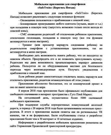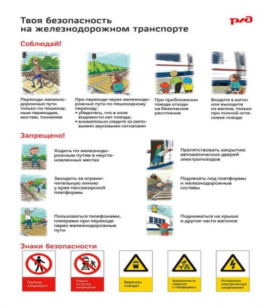 В 2018 году от движущихся поездов и воздействия электротока травмировано 18 подростков, в том числе 11 детей смертельно. С начала 2019 года уже пострадало 9 детей, из них 3 подростка смертельно. В целях предупреждения травмирования детей необходимо объяснить подросткам, что: - запрещено переходить железнодорожные пути перед приближающимся поездом, необходимо ходить только в установленных местах по пешеходным переходам и мостам; - не допускается детям играть вблизи железнодорожных путей, а также на мостах; - категорически запрещено подниматься на вагоны и цистерны стоящих поездов, так как можно попасть в опасную зону воздействия высокого напряжения 27000 В от линий контактной сети; Рекомендуем довести до подростков, что применение наушников и разговоры по мобильному телефону около железнодорожных путей не позволит своевременно услышать приближение поезда и может привести к травмированию и гибели. Соблюдение правил безопасности на железной дороге позволит сохранить здоровье и жизнь ваших детей!
